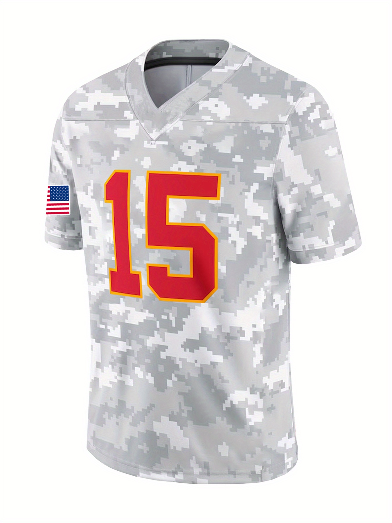 Men's #15 Retro Grey Camo Sport Jersey - Breathable V-Neck Short Sleeve with USA Flag Patch & MES, Loose Fit for Training, Casual Wear, Outdoor Activities & Holidays, Comfortable Sports Apparel, Best for Christmas, Perfect for Thanksgiving
