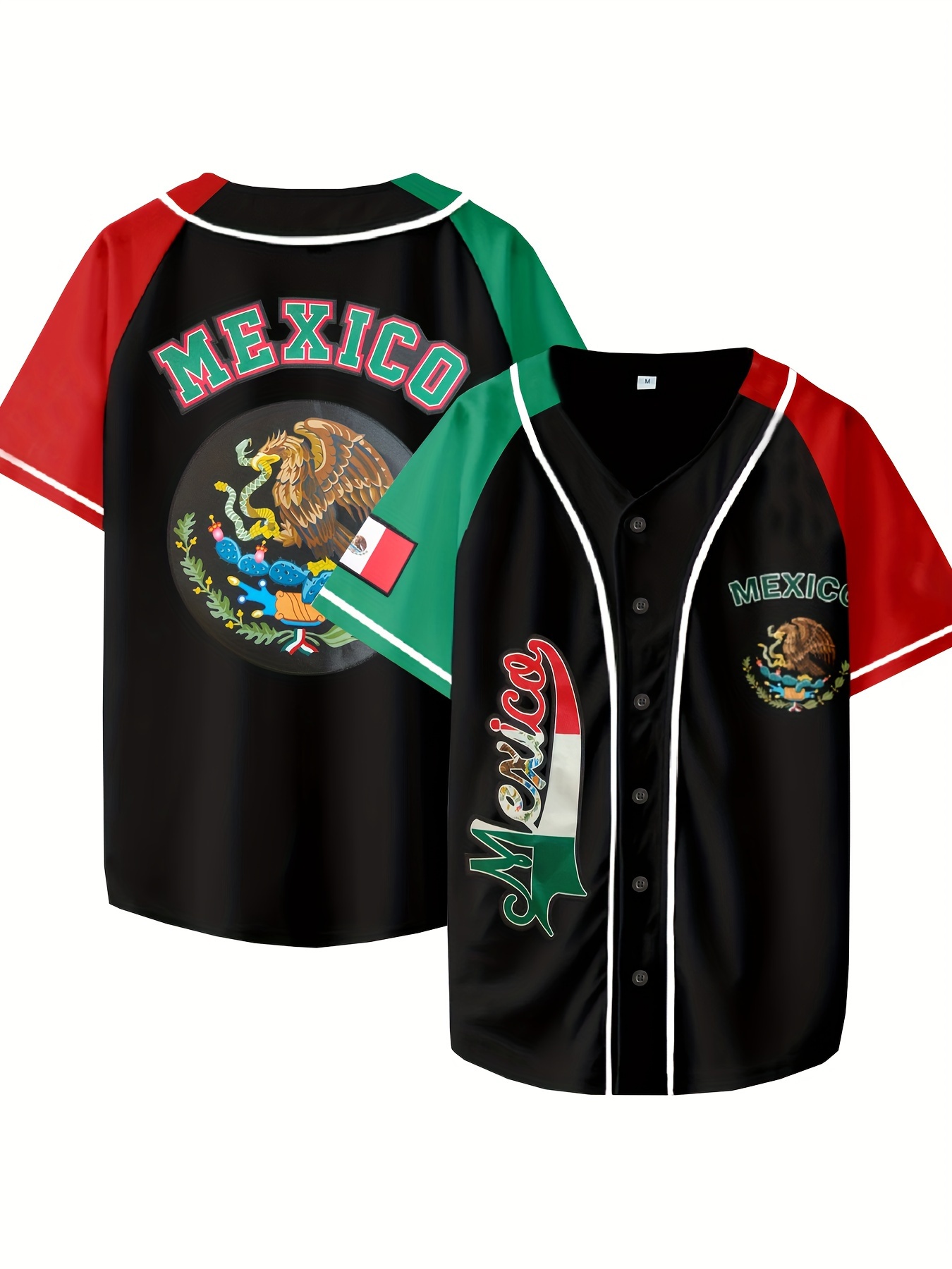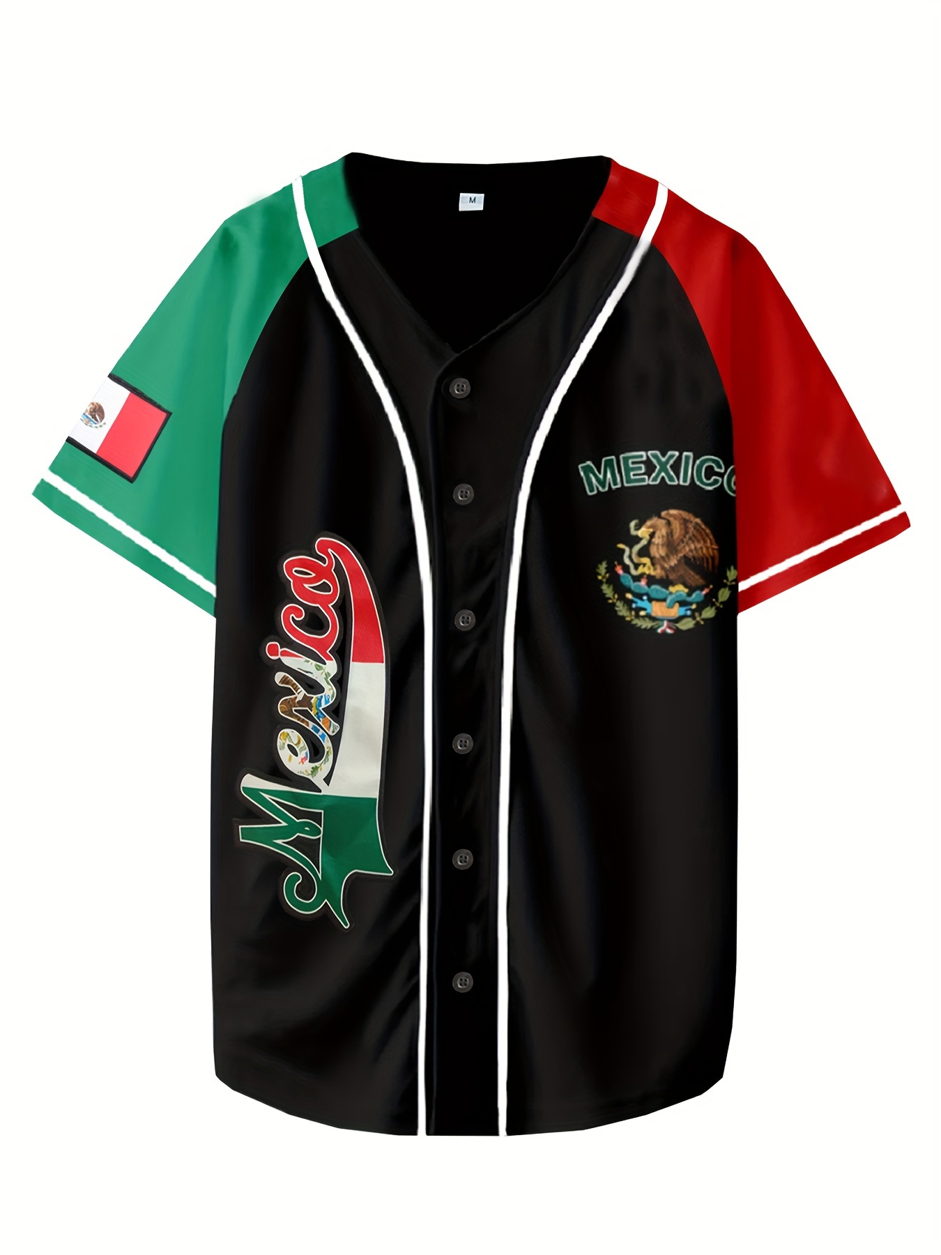 Men's Mexican Style Baseball Jersey - Retro Mexico Letter & Eagle Patriotic Design, Breathable V-Neck Button-Up Shirt with Raglan Sleeves, Loose Fit for Sports, Parties & Casual Wear, Cultural Event Attire, Detailing
